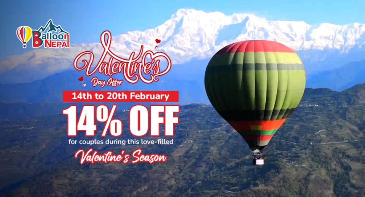 पोखरा । यस वर्षको भ्यालेन्टाइन डे (प्रणय दिवस)को अवसरमा विशेष छुटमा हट एयर बेलुन उड्न पाइने भएको छ । नेपालमा एक मात्र हट एयर बेलुन सन्चालन गरिरहेको कम्पनी बेलुन नेपालले भ्यालेन्टाइन डेको अवसरमा १४ प्रतिशत छुट अफर दिइएको कम्पनीका अध्यक्ष बिक्रम बाडेले...