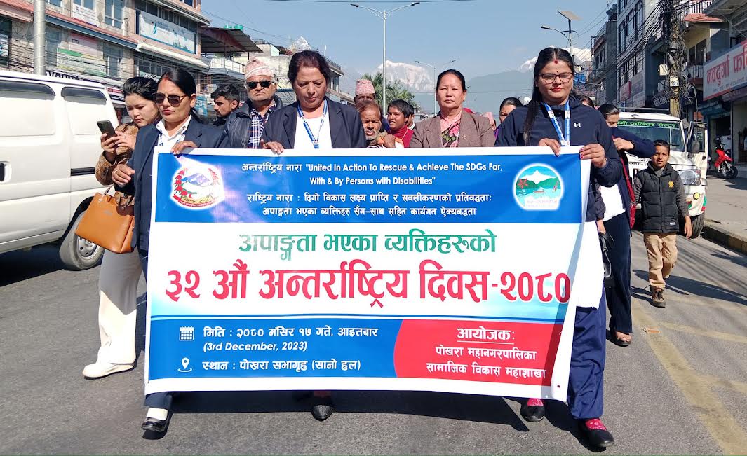 पोखरा। ‘दिगो विकास लक्ष्य प्राप्तिको प्रतिबद्धता अपाङ्गता भएका व्यक्तिको अपनत्व र नेतृत्व सहितको ऐक्यबद्धता’भन्ने नारासहित यस वर्षको अपाङ्गता दिवस मनाइएकोे छ । अपाङ्गता भएका व्यक्तिहरुको ३२ औँ अन्तर्राष्ट्रिय दिवस पोखरामा ¥याली सहित कार्यक्रम गरी मनाइएको...