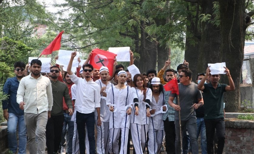 काठमाडौँ । नेपाली कांग्रेस निकट विद्यार्थी संगठन नेविसंघले भ्रष्टाचारविरुद्ध विरोध प्रर्दशन गरेको छ । आइतबार बिहान १० बजे नविसंघका नेता कार्यकर्ताहरुले कैदीको भेषमा भ्रष्टाचारविरुद्ध सांकेतिक विरोध प्रदर्शन गरेका हुन् । भ्रष्ट्राचारविरुद्ध शून्य सहनशीलता...