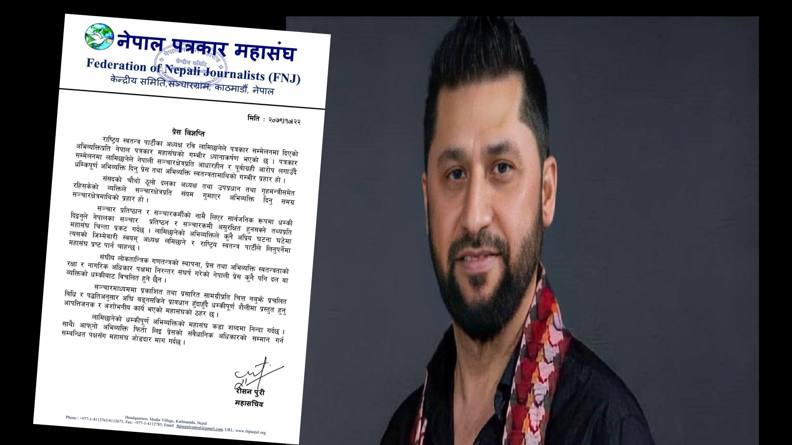पोखरा । नेपाल पत्रकार महासंघले राष्ट्रिय स्वतन्त्र पार्टीका सभापति रवि लामिछानेले दिएको अभिव्यक्ति प्रति आपत्ति जनाएको छ । महासंघले आइतबार साँझ विज्ञप्ति जारी गर्दै लामिछानेले आइतबार गरेको पत्रकार सम्मेलनमा नेपाली सञ्चारक्षेत्रप्रति आधारहीन र पूर्वाग्रही...