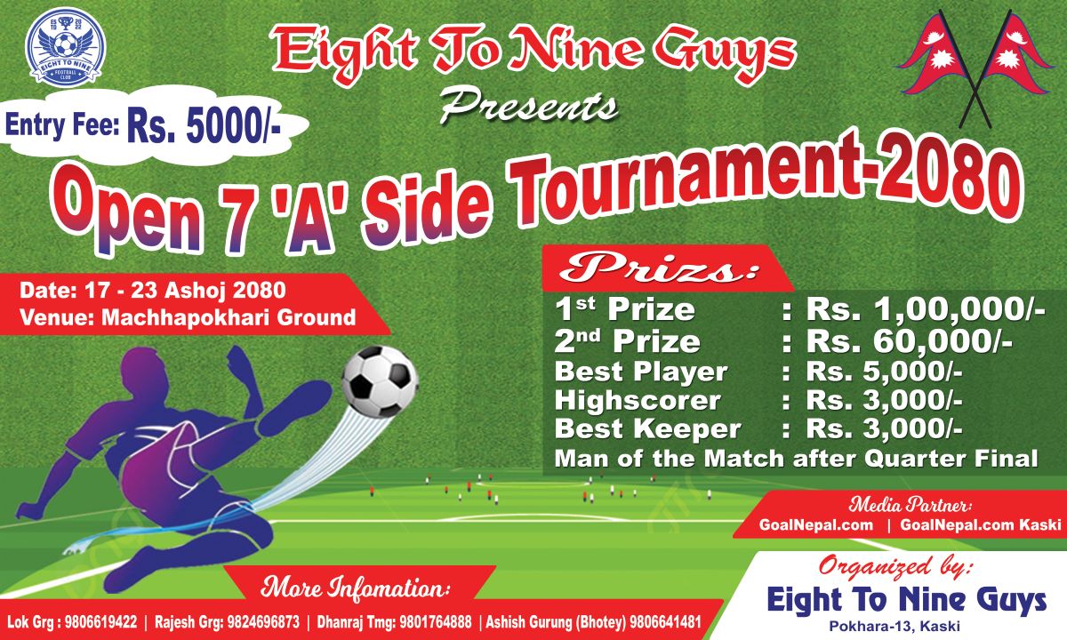 पोखरा । एट टु नाईन युवा क्लबको आयोजनामा १७ असोज देखि खुल्ला सेभेन ए साइड फुटबल प्रतियोगिता हुने भएको छ । ‘युवा एकता, खेलकुद विकास तथा स्वास्थ्यका लागि खेलकुद’ भन्ने मूल नाराका साथ फुटबल प्रतियोगिताको आयोजना हुन लागेको हो । २३ असोजसम्म...