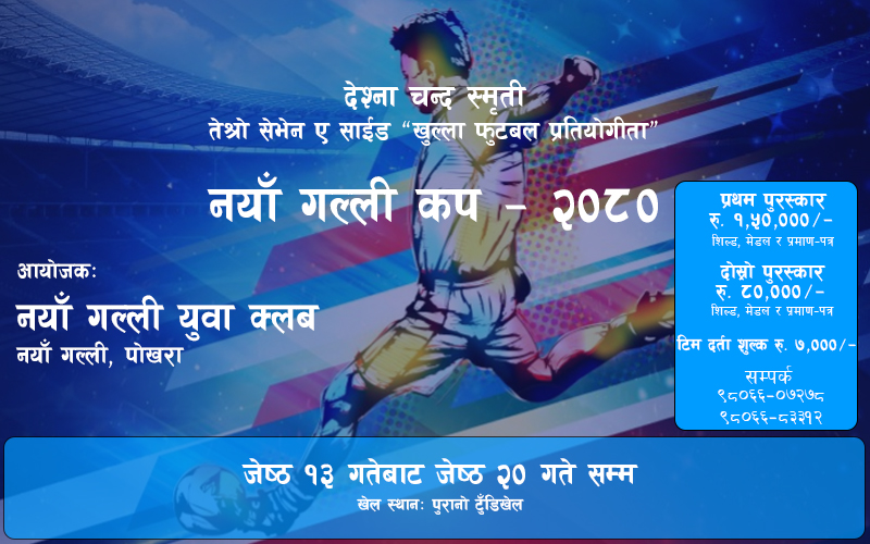 पोखरा । पोखरामा आयोजना हुने तेस्रो देश्ना चन्द स्मृति तेस्रो सेभेन ए साइड खुल्ला फुटबल प्रतियोगिता २०८० को तयारी तिब्र पारिएको छ । पोखरा महानगरपालिका १ स्थित नयाँ गल्ली युवा क्लबको आयोजनामा जेठ १३ देखि २० गतेसम्म हुने प्रतियोगिताको तयारी तिब्र पारिएको...