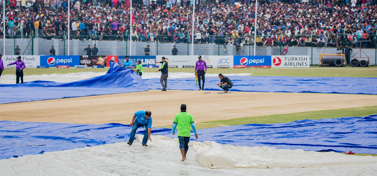 काठमाडौँ ।एसीसी प्रिमियर कप अन्तर्गतको फाइनल खेल वर्षाको कारण रोकिएको छ । नेपाल र यूएईबीच भइरहेको खेल पानी परेसँगै खेल रोकिएको हो । अहिले मैदानमा कभर लगाइएको छ । खेल रोकिनुअघि यूएईले १६ ओभरमा ५ विकेटको क्षतिमा ६० रन बनाएको छ । नेपालका लागि करन केसीले...