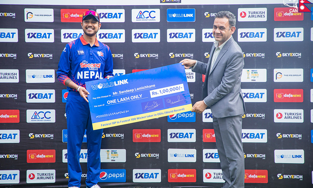 काठमाडौं । क्रिकेटर सन्दीप लामिछानेले र्वल्ड लिङ्कको तर्फबाट एक लाख नगद पुरस्कार प्राप्त गरेका छन् । सर्वाधिक छिटो १०० एक दिवसीय विकेटको किर्तिमान राखेका उनलाई ट्रफी र उपहार पनि प्रदान गरिएको छ । आज कतारविरुद्धको म्याचपछि सन्दीपलाई उपहार हस्तान्तरण गरिएको...