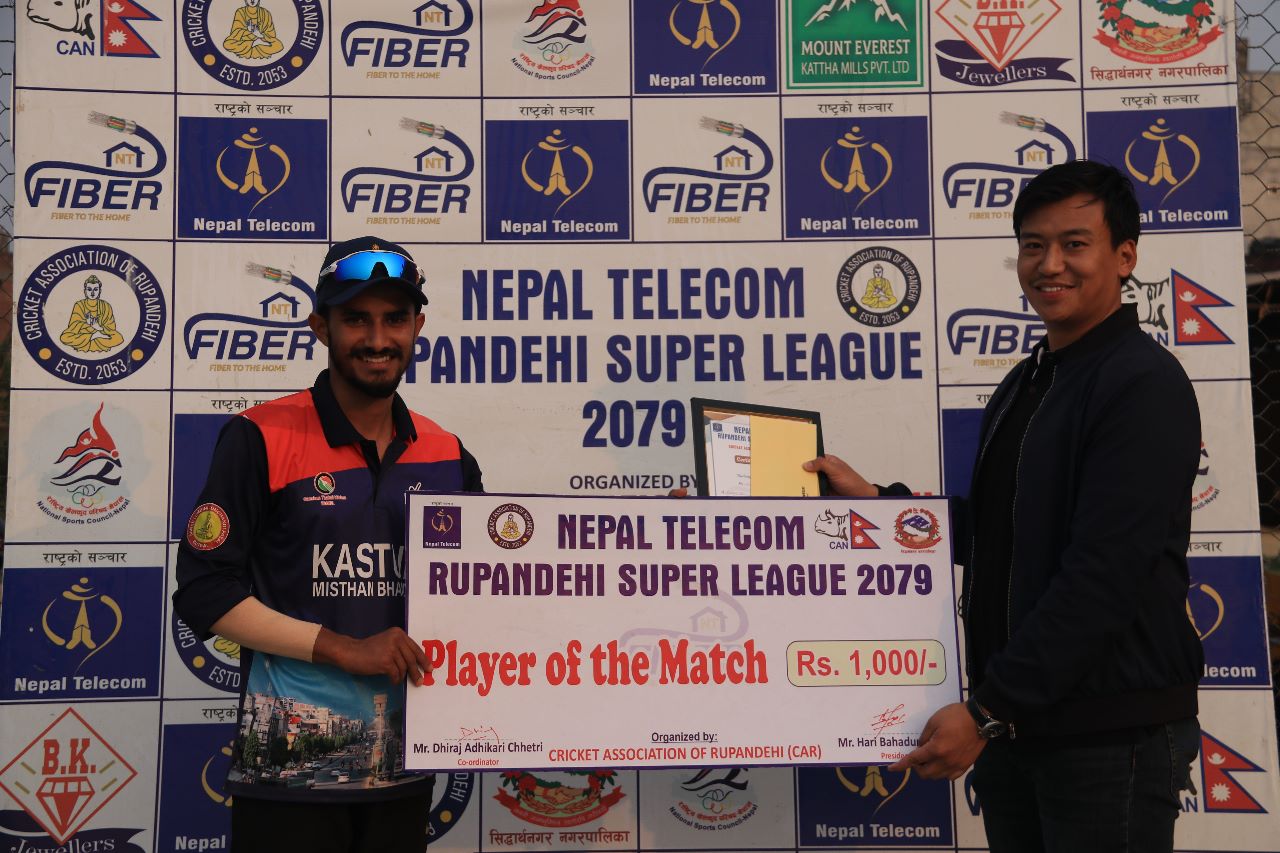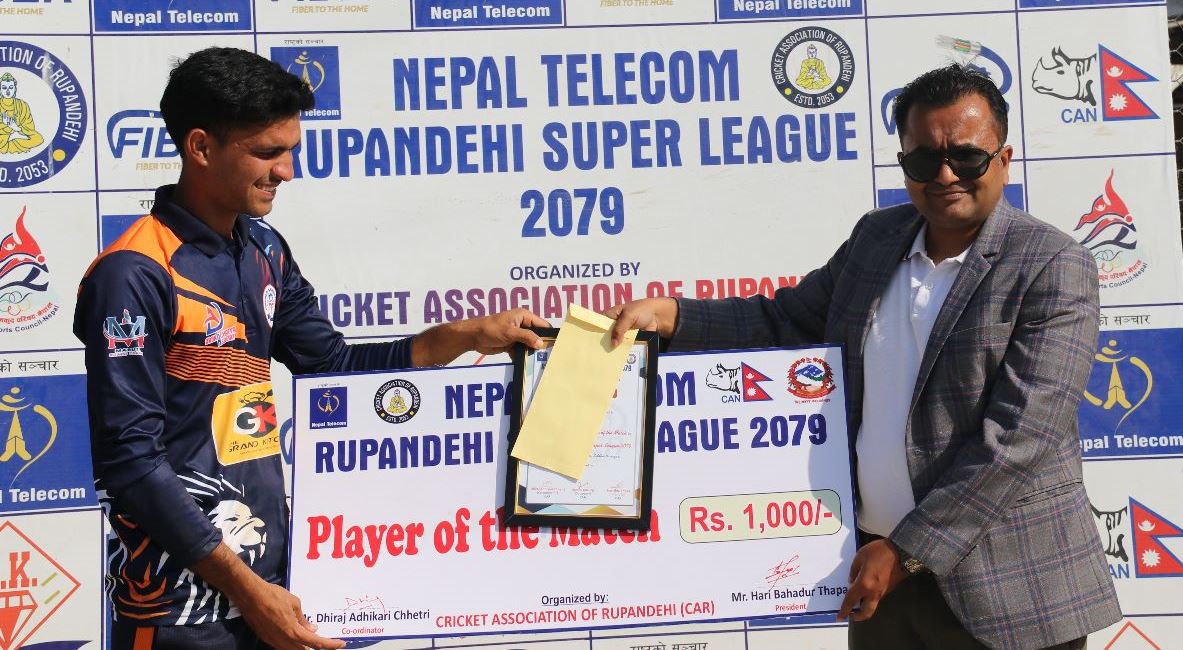 भैरहवा । तिरुपति क्रिकेट क्लब भैरहवामा जारी नेपाल टेलिकम रुपन्देही सुपरलिग क्रिकेट प्रक्रियोगिता अन्तर्गत डिभिजन ‘ए’को सोमबारको खेलमा विजयी भएको छ । तिरुपतिले बुटवल–११ क्रिकेट क्लबलाई ८० रनले पराजित गर्दै जित निकाल्न सफल भएको हो । सिद्धार्थ रंगशालामा...