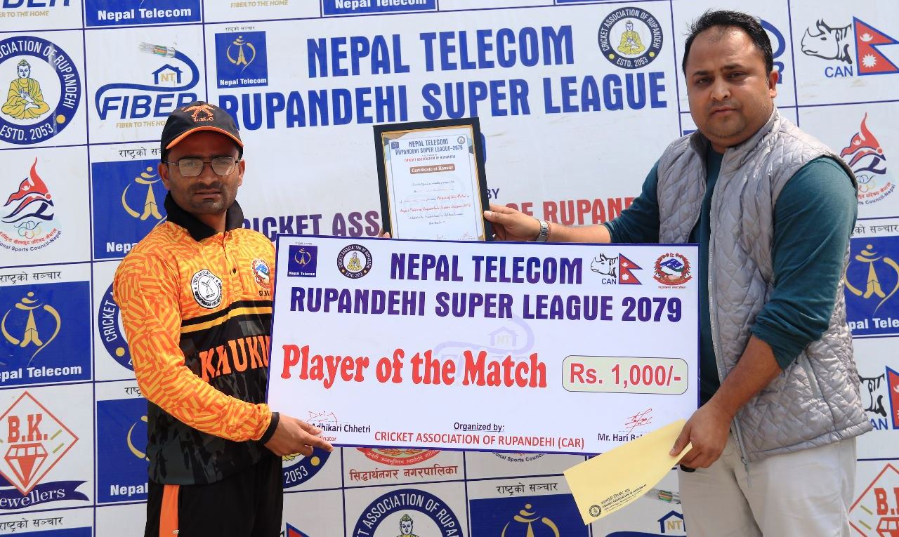 भैरहवा । रुपन्देही क्रिकेट संघको आयोजनामा भैरहवामा जारी नेपाल टेलिकम रुपन्देही सुपरलिग क्रिकेट प्रक्रियोगिता अन्तर्गत डिभिजन ‘ए’को शनिबारको खेलमा लुम्बिनी खुकुरी क्रिकेट क्लब विजयी भएको छ । लुम्बिनी खुकुरीले सैनामैना क्रिकेट क्लबलाई ७ विकेटले पराजित...