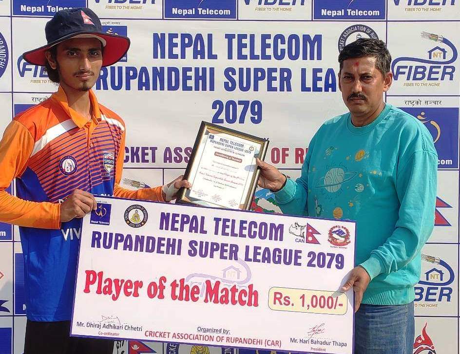 भैरहवा । रुपन्देही क्रिकेट संघको आयोजनामा भैरहवास्थित सिद्धार्थ क्रिकेट रंगशालामा जारी नेपाल टेलिकम रुपन्देही सुपरलिग क्रिकेट प्रक्रियोगिता अन्तर्गत डिभिजन ‘बी’को शुक्रबारकोे खेलमा बुटवल राइनोजले लुम्बिनी शाक्यानलाई १ सय ४३ रनको फराकिलो अन्तरले पराजित...