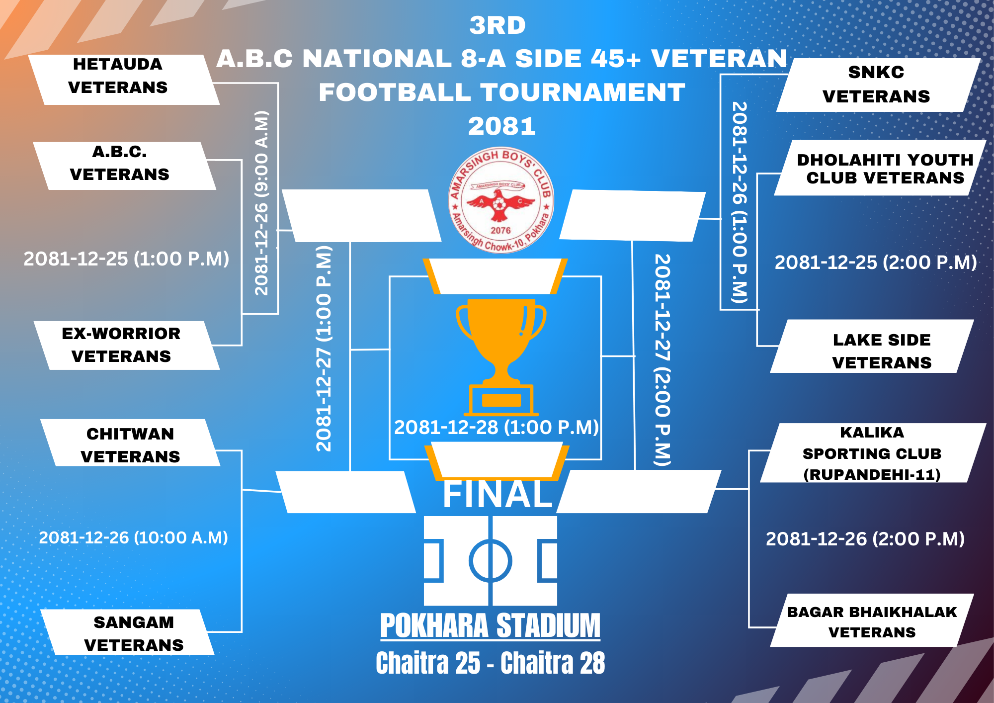 पोखरा । अमरसिंह व्वाइज क्लबको आयोजनामा सोमबारदेखि तेश्रो एबिसी एट ए साईड भेट्रान्स फुटवल प्रतियोगिता हुने भएको छ । “आपसी सद्भभाव, स्वास्थ्य र भाईचाराका लागि फुटबल” भन्ने मुल नारा सहित पोखरा रंगशालामा आयोजना हुने उक्त प्रतियोगितामा देशभरिबाट १० टीमको...