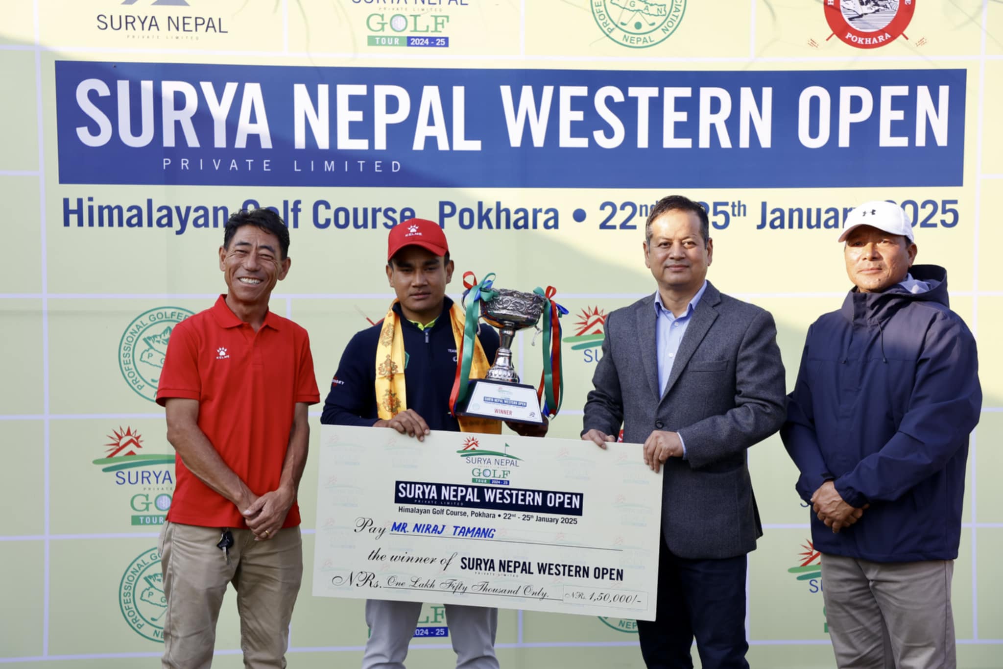 पोखरा । सूर्य नेपाल गल्फ टुर २०२४-२५ अन्तर्गतको चौथो प्रतियोगिता सूर्य नेपाल वेस्टर्न ओपनको उपाधि निरज तामाङले जितेका छन्। जयराम श्रेष्ठलाई तीन स्ट्रोकले हराउँदै उपाधि जित्ने क्रममा निरजले समग्रमा १-अन्डर २०६ स्कोर गरे। उनले आज भने ४-ओभर ७३ स्कोर...