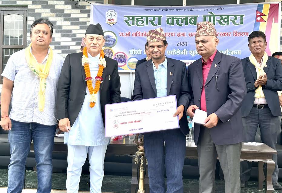 पोखरा । नेपाल खेलकुद पत्रकार मञ्च गण्डकीको पत्रकार कल्याणकारी अक्षयकोषमा पोखराको सहारा क्लवले ५१ ह्जार रुपैया आर्थिक सहयोग गरेको छ । सहारा क्लवको २६ औं बार्षिकोत्सवको अवसरमा क्लवले आइतबार उक्त रकम बराबरको चेक मञ्चलाई हस्तान्तरण गरेको हो ।उक्त समारोहका...