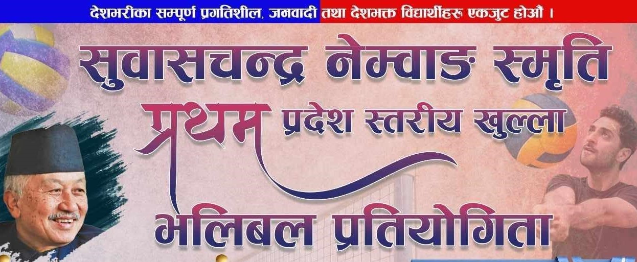 पोखरा । नेकपा एमालेनिकट विद्यार्थी संगठन अखिल नेपाल राष्ट्रिय स्वतन्त्र विद्यार्थी युनियन गण्डकीको आयोजनामा भलिबल प्रतियोगिता हुने भएको छ । पोखरामा आउँदो भदौ २७ देखि ३१ गतेसम्म सुवासचन्द्र नेम्वाङ स्मृति प्रथम प्रदेशस्तरीय पुरूष खुल्ला भलिबल प्रतियोगिता...