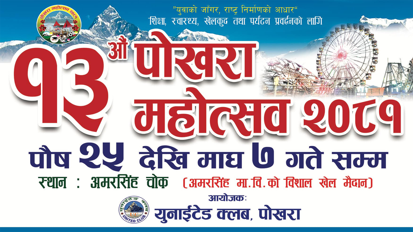 पोखरा । १३ औं संस्करणको पोखरा महोत्सव आगामी पुष २५ देखि माघ ७ गते सम्म पोखराको अमरसिंह चौरमा आयोजना हुने भएको छ । महोत्सवलाई भब्य र सभ्य बनाउनका लागि विभिन्न ३० वटा उपसमिति गठन गरिएको छ । महोत्सव आयोजक युनाईटेड क्लबका अध्यक्ष लोक बहादुर थापा मुल आयोजक...